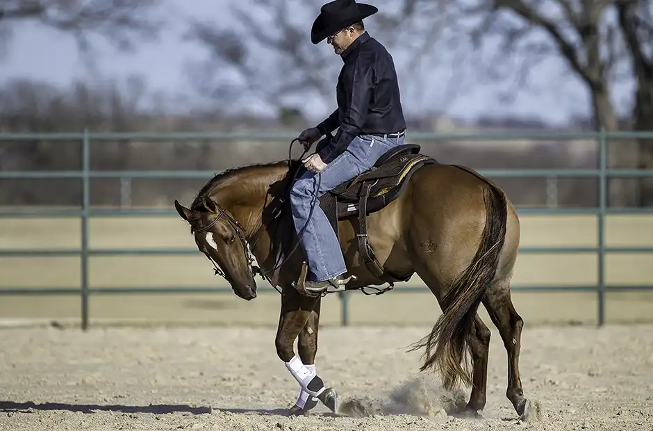 Not only is backing circles a great softening and suppling exercise, but it also helps set a horse up for executing spins and rollbacks better. When a lot of horses do a spin or rollback, they put their inside front foot too far forward and then have a hard time crossing over correctly. Backing circles gets the horse’s inside front foot to step back and over so that when he goes into a spin or rollback, his inside front foot is always stepping in the correct position.