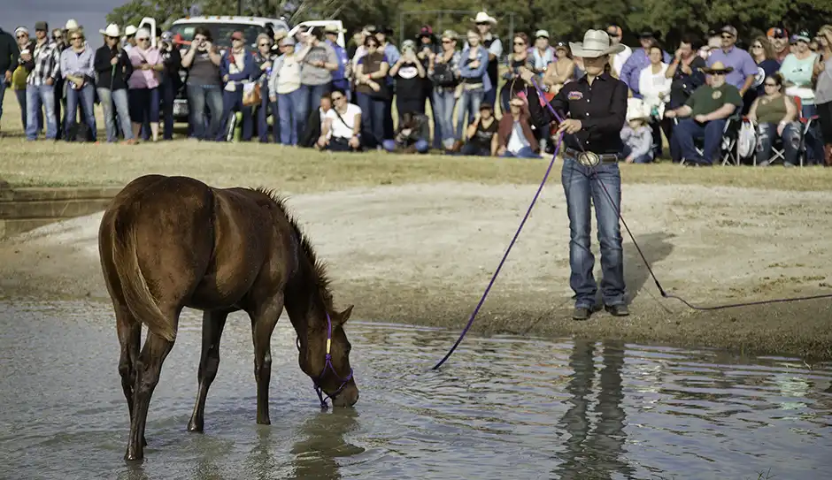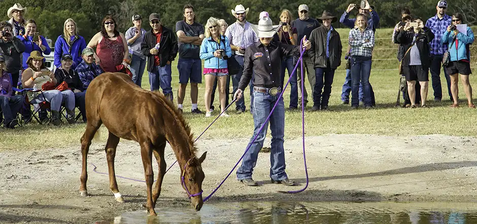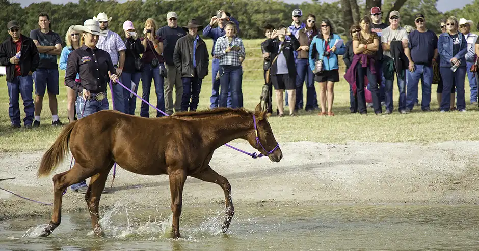 Water is a great obstacle for getting your young horse confident about negotiating from the ground at an early age. You’ll find that if you can get your young horse crossing through or over an obstacle well on the ground, when you eventually ask him to negotiate it under saddle, he’ll go right over it without a fuss. Like with anything you teach a horse, getting him to confidently step through water starts by breaking the obstacle down into the simplest steps possible. With a water obstacle, that means starting by getting your horse comfortable stepping through a puddle. Once he can handle a puddle, move on to a shallow stream. Then to a small pond and so on. As his confidence grows, challenge him a bit more by increasing the size and intensity of the obstacle you’re asking him to go through. Don’t go from a puddle to the ocean. That isn’t fair to him and would only be setting him up for failure.