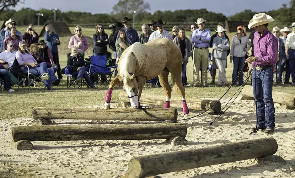 One of the most important things you can encourage a horse to do when introducing him to an obstacle is let him perform his own safety check of it. Here, Method Ambassador Josh Standen waits patiently as Porsche inspects a log in the log circle.
