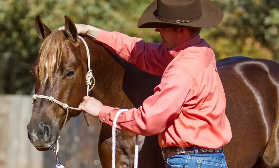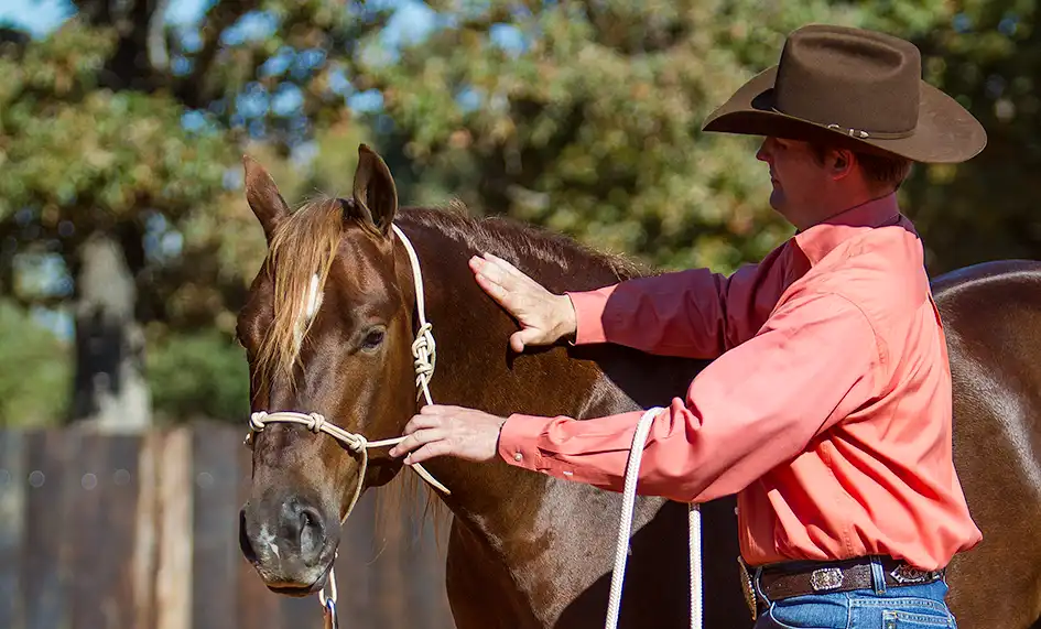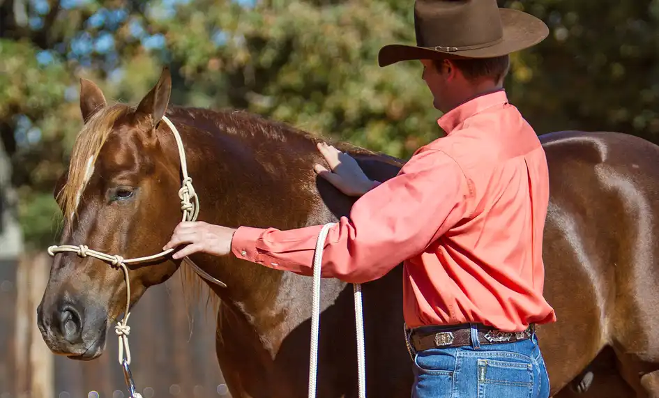 Always rub the horse with a lot of feel to your hand. Rubbing is a soothing sensation that will relax and comfort him. Patting doesn’t feel comfortable to the horse and will make him want to get away from you.