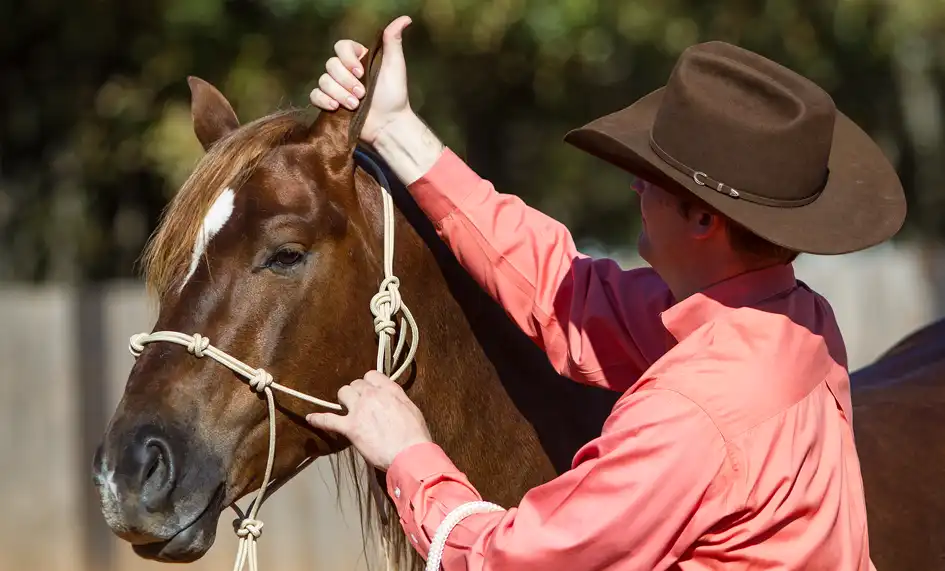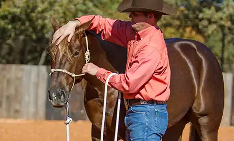 You’ll get your horse over his fear by desensitizing him to your hands touching his ears using the Approach and Retreat Method. You’ll start by rubbing your horse’s body in an area he’s comfortable with and then gradually working your way to his ears. By approaching him and then retreating when he stands still and shows a sign of relaxing, you’ll build his confidence. When a horse relaxes, he’ll do one of five things: he’ll lick his lips, lower his head, blink his eyes, cock a hind leg or take a big breath. When he stands still and shows one of these signs of relaxing, you’ll retreat and go back to rubbing him in a spot he’s comfortable with, such as his neck or withers. Sometimes a horse won’t show you any of these signs, but as long as he stands still for 15 seconds, you can take away the pressure. If a horse stands still for 15 seconds, he’s telling you that he’s not interested in running. He may still be a little frightened, but he’s starting to use the thinking side of his brain and has chosen to stand still.