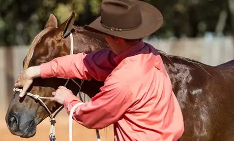 When the horse stands still and shows a sign of relaxing, retreat and rub his topline in a place he’s comfortable with you touching him.