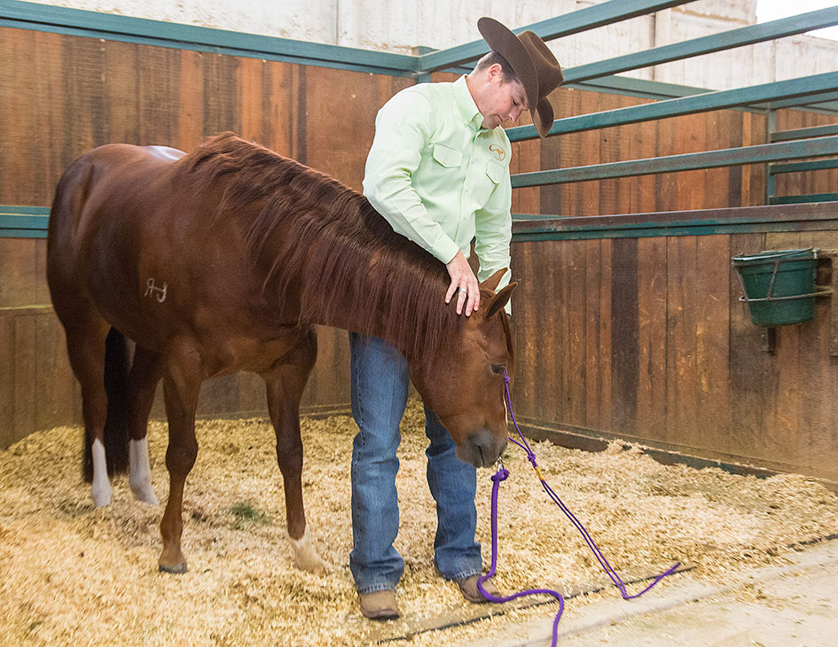 Every time I walk into a stall to catch my horses, I flex them five times on each side before I even walk them out of the stall. I also flex them five times on each side before I take the halter off and put them away for the day. That way, the first and last thing they remember when I walk into the stall is that I scratch them and make them feel good. It’s also a good little reminder that I’m the one in control. It’s very important that you don’t let your horse dominate you.