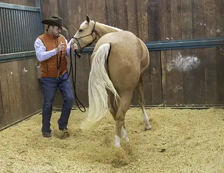 The secret is if you even smell that that horse is going to look at you, turn around and walk away from him. If he doesn’t look at you, go back to his hindquarters again. Keep using that method until he faces you.