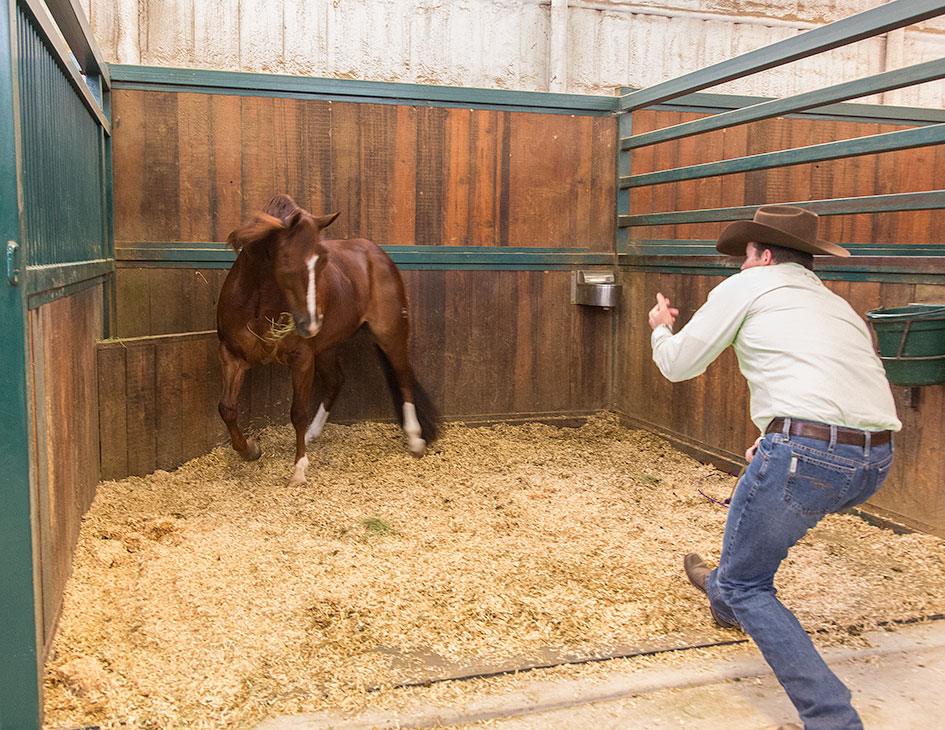 If your horse does turn his butt towards you when you approach the stall, you’ll apply pressure to him to make him feel uncomfortable until he turns and faces you with two eyes. A word of caution here: You have to be careful when you’re working with a horse in a stall. I don’t actually get in there with a horse too much. I usually just stand in the doorway. If you get in the stall with him, and you start applying pressure, especially if he’s disrespectful and pushy, or if he’s frightened, he might kick you. Since you’re in a tight enclosure, the chance of you getting kicked is pretty high. You have to use common sense here.