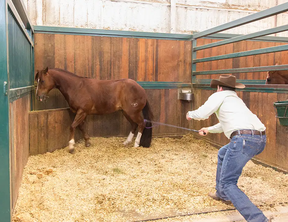 With horses that are especially disrespectful and are kept in a larger stall, when they see you approaching, they’ll run to the corner, stick their heads into the corner and show you their butts. That’s when I use the stick and string rather than the lead rope, because I can create more pressure with it and stay a safe distance away from the horse. Remember, the Handy Stick is nothing more than a 4-foot extension of your arm.