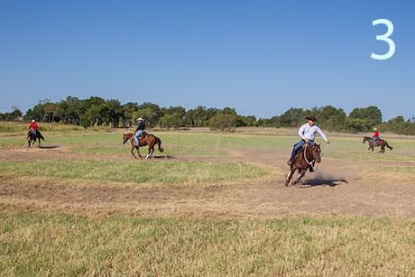 2 & 3. Although you’re riding in a group, you’ll direct your horse around the pattern, depending on what he needs. Anytime you feel him leaning in a certain direction or anticipating a turn, you’ll turn him in the opposite direction. So if you feel him leaning right, you’ll turn him left. In that way, this exercise is very much like Confused Loping, one of the first exercises you taught the horse outside.