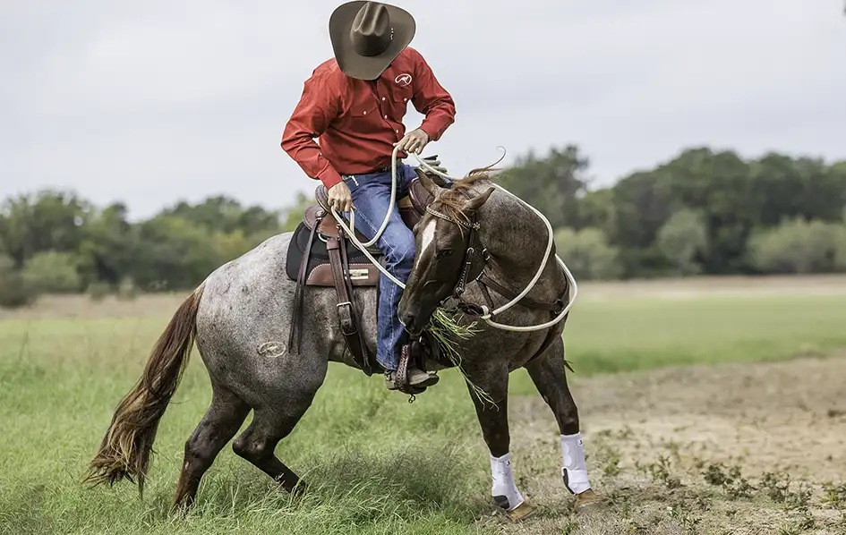 When I say hustle his feet, I do mean hustle his feet. This correction won’t work if you let the horse graze for five minutes and then barely get him to move. If you let him drag his feet, he’ll be too busy chewing on the grass and dreaming about his next snack to pay any attention to you. If he grabs a mouthful, make him hustle his feet like his life depends on it. Do serpentines, lope him in a circle, gallop him in a straight line, it doesn’t matter what you do, but get some energy in it. Remember, horses are basically lazy creatures and the worst punishment you can give them is hard work.